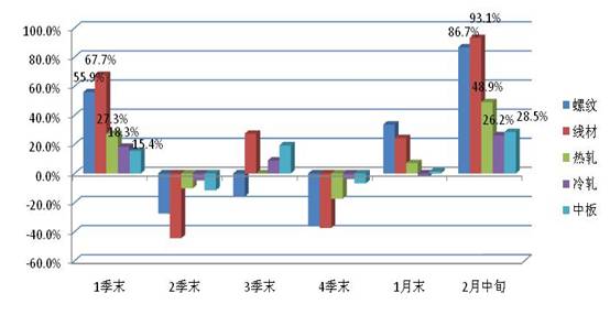 截止2月中旬,全國主要地區(qū)鋼材庫存環(huán)比漲幅均大幅增長,其中線材庫存比1月中旬上升了93.1%、鋼筋上升了86.7%、熱卷上升了48.9%、中板上升了28.5%、冷板上升了26.2%。并且從圖列數(shù)據(jù)的走勢看,庫存積聚的速度超過了上年同期,特別是鋼筋、線材和熱卷體現(xiàn)得更明顯。