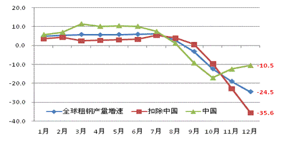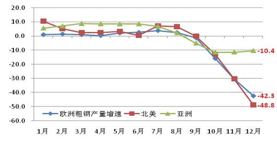 從三大洲粗鋼產(chǎn)量的增長情況看,能得出更明顯的結(jié)論,就是歐美粗鋼產(chǎn)量在12月份增速分別為負(fù)增長42.3%和48.8%時,亞洲地區(qū)粗鋼產(chǎn)量在后兩個月沒有繼續(xù)減少。