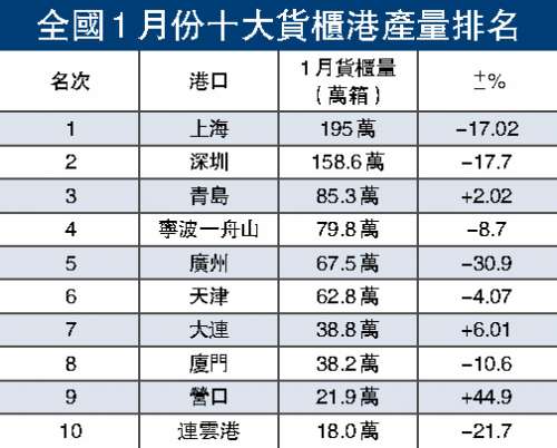 統計顯示,1月港口受當前的金融危機風暴及農歷春節雙重影響,當月貨柜量僅以899.13萬箱,與去年同期比較,跌13.8%,其中沿海港口占841.81萬箱,下滑12.91%。內河港口57.32萬箱,降幅更達25.84%。