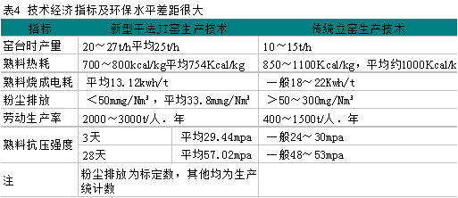 由表1~表4可以清楚看出:JT窯技術(shù)與傳統(tǒng)立窯的窯爐結(jié)構(gòu)、配料方案、操作方法、生產(chǎn)工藝等都有絕然不同之處,正是這種不同才導(dǎo)致了技術(shù)經(jīng)濟指標(biāo)先進(jìn)與落后的差距。因此把新型半干法JT窯水泥生產(chǎn)技術(shù)視為落后的傳統(tǒng)立窯技術(shù)是不妥的,新型半干法JT窯技術(shù)≠傳統(tǒng)立窯。