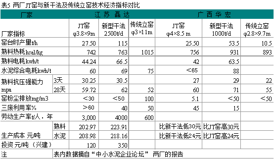 根據(jù)新型半干法JT窯水泥生產(chǎn)技術(shù)的特點,它的技術(shù)定位是適合中小水泥企業(yè)的先進(jìn)技術(shù)。不是與大型經(jīng)濟規(guī)模新型干法的競爭技術(shù),而是新型干法技術(shù)的補充。因為新型干法技術(shù)是大型化技術(shù),生產(chǎn)水平受生產(chǎn)線規(guī)模制約,2000t/d以下生產(chǎn)線的技術(shù)經(jīng)濟指標(biāo)并不先進(jìn),因此不適合中小水泥企業(yè)。新型半干法JT窯水泥生產(chǎn)技術(shù)正好適合600~1500t/d規(guī)模,填補了新型干法技術(shù)不適合中小水泥企業(yè)的技術(shù)空白,也為水泥工業(yè)產(chǎn)業(yè)政策提供了中小水泥企業(yè)的支撐技術(shù)。通過江蘇磊達(dá)、廣西華宏既有新型干法生產(chǎn)線,又有JT窯生產(chǎn)線兩廠的生產(chǎn)實踐,有力的證明了新型半干法水泥生產(chǎn)技術(shù),是適用于中小水泥企業(yè)的先進(jìn)技術(shù),F(xiàn)將兩廠實際生產(chǎn)技術(shù)經(jīng)濟指標(biāo)能列入表5: