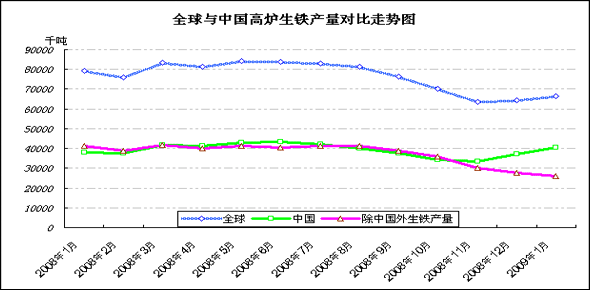 2008年下半年以來,受美國金融危機影響,全球經濟增速趨緩,鋼鐵市場持續低迷。因此,主要用于高爐煉鐵的焦炭需求也被大幅壓縮。中國的焦炭產量占世界總產量的一半以上,焦炭出口量占全球貿易量的60%。因此除中國外,其他國家的生鐵產量下降,直接影響到我國的焦炭出口市場。見圖2.