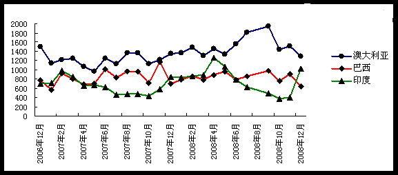 中國進口澳洲/巴西/印度鐵礦石統計(數據來源 中國海關):