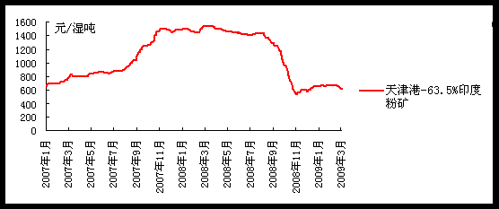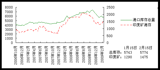 二、2009年2月進口鐵礦石現貨市場回顧 2月中國進口鐵礦石現貨市場盡顯疲態,鋼鐵企業原料采購熱情驟然下降,市場成交較春節期間明顯萎縮。2月末,現貨市場63.5%印度粉礦報價由2月初最高時的85-86美金/噸,下跌至目前的73美金/噸,跌幅15%,而價格下跌后市場成交并未明顯增加,表明2月末的現貨鐵礦石價格水平距離鋼鐵企業心理價位仍有差距。 由于前期進口數量較大,2月中國新到港鐵礦石船只比1月大幅增加,天津,曹妃甸等港口出現嚴重壓港情況,進口鐵礦石港口庫存已體現出增加跡象,尤以現貨市場貿易礦為主,截止2月27日印度鐵礦石港口庫存總量已經重新回到1539萬噸,比2月初增加14.5%,比2009年1月初增加20%。引起了業內關注,雖然多數鋼廠目前礦石庫存較低,使許多鋼鐵企業仍采取觀望態度。 印度鐵礦石現貨價格統計(umetal統計):
