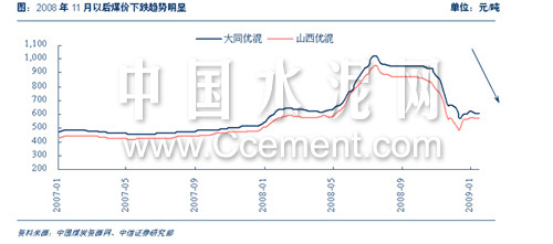 中信證券首席分析師潘建平也贊同了這個(gè)觀點(diǎn),他認(rèn)為2009年煤價(jià)保持趨勢性回落已成必然趨勢,2009年煤炭均價(jià)將比2008年下降15%左右,相應(yīng)可以降低水泥成本約6%。