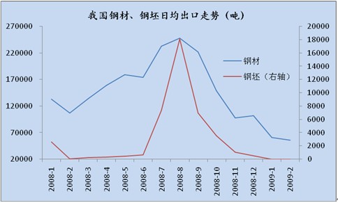 從近期海關發布的進出口最新數據來看,2009年1月份,我國出口鋼材188萬噸,比去年同期下降54.5%,較去年12月份回落129萬噸;2月份出口鋼材再度萎縮至156萬噸,較1月份下降了32萬噸,雖然今年2月僅28天,但論日均出口量仍舊較1月有所回落。鋼坯市場由于08年以來受稅率影響,出口形勢一直處于較低水平,其波動幅度對國內供需很難構成影響,故淡化。