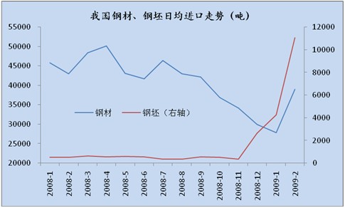 09年我國鋼鐵進口市場均出現了不同幅度的增長。2月份進口鋼材109萬噸,較1月增長了23萬噸,進口鋼坯31萬噸,較1月增長18萬噸。從下圖中可以明顯的看出,鋼坯的進口增長勢頭尤為迅猛。