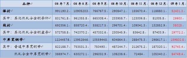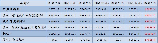 08年12月1日,我國調整了部分鋼鐵產品出口稅率政策,其中將熱軋板卷的5%出口關稅取消。但是從09年1月份的出口形勢來看,熱軋板卷出口環比總量下降12萬噸,調稅的市場效應無法體現。另外棒線材(不含螺紋鋼,下同)在出口稅率不變的情況下,1月出口環比下降16萬噸。且預計2月份熱軋板卷與棒線材的出口量還將進一步萎縮。