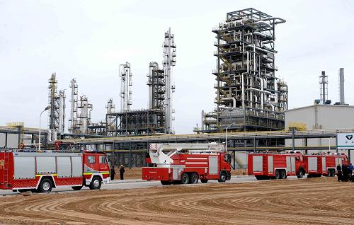 3月16日,消防車在內蒙古伊泰集團煤制油公司院內執行消防安保任務。