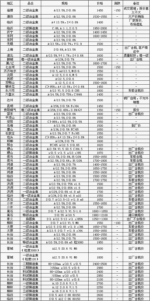 3月25日全國各地焦炭價格匯總