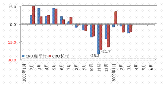 1、從大品種上看,CRU國際市場長材、扁平材價(jià)格指數(shù)均大幅下跌,但長材價(jià)格較為活躍,扁平材跌幅相對較深。去年11月份是長材、扁平材價(jià)格下跌最為明顯的時(shí)期,扁平材價(jià)格指數(shù)下跌了25.2個(gè)百分點(diǎn),長材下跌21.7個(gè)百分點(diǎn),扁平材跌幅比長材高3.5個(gè)百分點(diǎn)。值得注意的是1月份長材價(jià)格曾大幅回升,主要是受亞洲市場鋼筋、線材等建筑用鋼材的補(bǔ)庫因素的影響,實(shí)際需求增長有限。