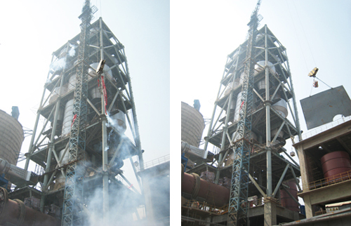 由邯鄲中材冀中項目經理部承建的河北省鹿泉東方鼎鑫水泥有限公司4000t/d熟料生產線擴建工程窯尾預熱器框架安裝,在冀中項目部全體員工的辛勤努力和艱苦奮斗下,于3月28日上午11點58分順利封頂。