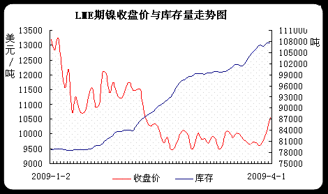 截止到4月1日 LME三月期鎳收盤10100 美元/噸,較本月初上漲600 美元,庫存 增加至107682 噸。本月LME鎳行情窄幅震蕩,連續(xù)拉漲,依然在基本面和政策面之間尋求方向。月初,倫銅受中國政府儲備和倫敦期貨交所銅庫存下降的利好刺激而上漲,帶動LME鎳一起反彈。月中,美聯(lián)儲公告表示將大量購買長期國債及抵押貸款支持證券,引發(fā)美元大幅下挫,而美國華爾街股市受中國經(jīng)濟增長8%的預(yù)期和美聯(lián)儲主席貝南克的關(guān)于今年美國經(jīng)濟將結(jié)束衰退的講話刺激而連續(xù)上揚,從而帶動國際原油和基本金屬價格上漲,在周邊市場利好氛圍的烘托下,LME鎳克服了庫存增加的負面影響而跟隨銅一起反彈,鎳價一度曾到達10400美元。