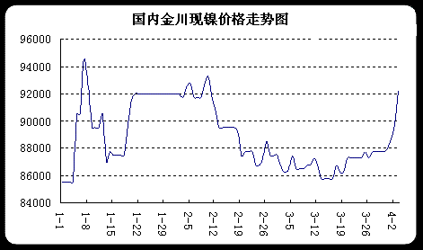 3月國內(nèi)現(xiàn)貨鎳消費依然冷清,但是受到LME鎳價反彈的帶動,價格出現(xiàn)了一定的程度的上漲。國內(nèi)上海有色1#電解鎳月末較月初上漲了1000元/噸,上海有色1#金川鎳月末較月初價格上漲了1500元/噸。另外金川公司在3月份兩次調(diào)整價格,3月12日金川鎳出廠價由86000元/噸下調(diào)至84000元/噸,降幅為2000元/噸,3月20日金川鎳出廠價由84000元/噸上調(diào)至86000元/噸,漲幅為2000元/噸。