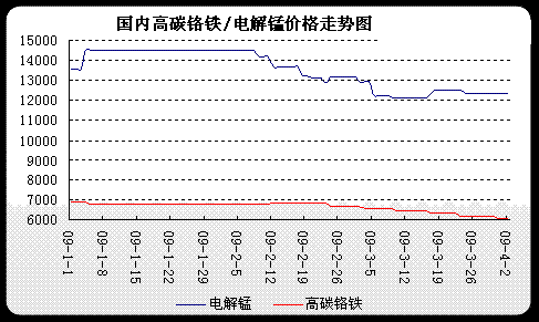 圖3:2009年1月-3月國內(nèi)高碳鉻鐵、電解錳價格走勢圖