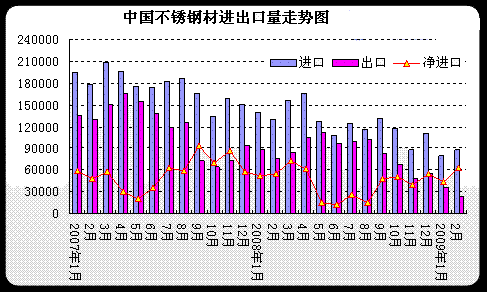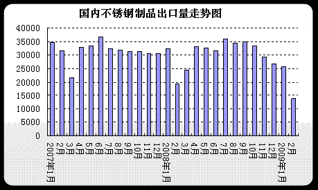 從據(jù)海關(guān)資料統(tǒng)計顯示,2009年2月份我國不銹鋼進口總量為87416噸,同比下降32.73%;2009年2月份不銹鋼出口量為23949噸,同比大幅下降68.22%,出口單月環(huán)比下降33.05%。不銹鋼制品方面,出口量環(huán)比下降幅度要遠遠大于不銹鋼其他材料,據(jù)統(tǒng)計2月份出口量為13847噸,同比下降28.67,環(huán)比大幅下降46.40%。