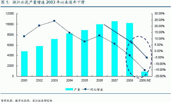 水泥需求萎靡,未來增長仍看房地產浙江水泥產量2003年以來,增速一直在下滑,2008年同比負增長;浙江省消耗水泥的基建項目份額較少,且近兩年來基建投資向涉及改善民生的項目傾斜,拉動水泥需求有限;水泥需求的回暖仍看房地產,不過目前浙江房地產新開工項目很少,短期內轉暖的可能性較小。