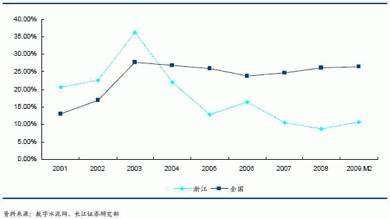 和水泥需求相對應,浙江固定資產投資自2003年到高峰以來,增速一直低于全國平均水平,而且逐年下滑,基本和水泥產量增速變化趨勢相符合。