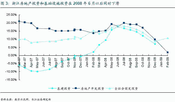 從近兩年的月度分項數據來看,2008年6月以前房地產投資和基礎設施投資一抑一揚,固定資產投資保持緩慢上升的趨勢;但是2008年6月以后房地產投資和基礎設施建設投資增速同時下滑,導致固定資產投資增速也一路下滑;那么固定資產投資在全國基建大干快上的情況下能不能拉動浙江水泥需求?
