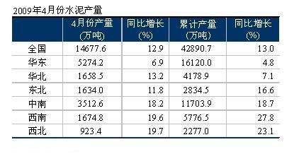 4月份華東地區水泥產量5,274萬噸,同比增長6.9%,扭轉了3月份水泥產量同比負增長的狀況;累計實現水泥產量16,120萬噸,同比增長4.8%。