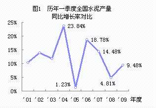 今年一季度全國水泥產量2. 8億噸,比去年同期增長9.5%。去年年初南方冰凍雨雪災害損失水泥產量1100多萬噸,今年在此基礎上的水泥產量增長率,在2000年以后仍屬較低水平(見圖1)。預計今年上半年全國水泥產量6.8億噸,比去年上半年增長4.6%。