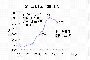 水泥價格連續四個月下降,但全國水泥價格總水平仍比去年同期高。三月份全國水泥平均出廠價格每噸282元,比去年10月份下降9元,比去年同月高22元(見圖2)。
