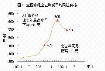 煤炭價格下降,但仍處于較高價位。三月份水泥企業煤炭購進價格平均每噸547元,比去年10月份下降58元,比去年同月高98元(見圖3)。