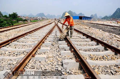 位于廣西賀州市平桂管理區(qū)黃田鎮(zhèn)的洛湛鐵路賀州段鐵軌上,工人在為即將通車運營作最后準備。