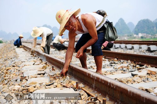 位于廣西賀州市平桂管理區(qū)黃田鎮(zhèn)的洛湛鐵路賀州段鐵軌上,工人在進行進沙施工。