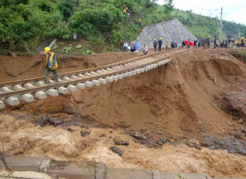 連日來,貴州省六盤水市烏蒙山區一帶連降暴雨,大面積山洪爆發,僅6月29日白天,水紅鐵路工務防洪值班人員巡查線路時就發現K36+828、K48+020、K49+700、K50+100、K51+500、K54+100等六處險情,并迅速組織力量排除了險情。確保了列車安全暢通運行。但由于暴雨不斷,位于K48+020處山頂上的馬場水庫發生潰壩事故,導致山洪暴發,沖毀水紅鐵路(法耳至茅草坪區間),導致水紅鐵路中斷運行。災情發生的第一時間,中鐵五局六公司水紅工務項目部拉響了警鈴,啟動了防洪應急預案,迅速組織300多搶險隊員冒雨趕到事發現場,及時展開搶險。昆明鐵路局接到災情報告后,副局長牛道安立即趕赴現場指揮搶險,成立了搶險應急領導小組,制定了搶險應急方案:決定搶險隊員兵分三路,一路上山分流洪水,一路疏通鐵路下的涵洞,另一路加工鋼筋籠裝片石填路基,目前搶險工作在緊張進行,預計一周內恢復水紅鐵路正常運行。