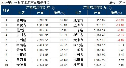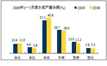 根據數字水泥網統計顯示,1~5月水泥產量57,336萬噸,同比增長13.34%。按產量份額來看,表現最為明顯的是華東地區從2008年占全國的40.8%降到37.5%,下降3個百分點;西南增長2個百分點,而西北增長較慢,與之冬季有關,有近5個月施工淡季;產量增長最快的是四川,內蒙、黑龍江和貴州;北京、上海、山東、浙江、天津為負增長。