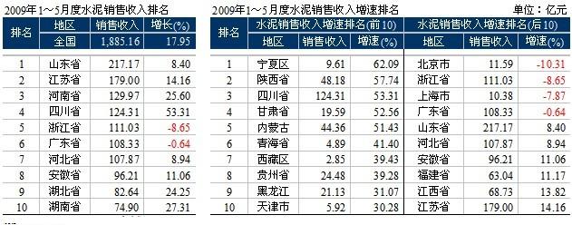 1~5月,水泥產業實現銷售收入1885.16億元,同比增長17.95%。銷售收入增速前10名的地區的增速都在30%以上:寧夏省銷售收入大幅上漲62.09%;四川在繼2007年收入大幅增長的情況下,受災后重建拉動,市場仍然向好,實現了124.31億元的銷售收入,同比增長53.31%。增速前10 的4個地區位于西北,三個位于西南。
