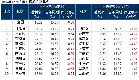 毛利率排名后10的多為沿海地區,大部分地區低于去年同期水平。2009年水泥市場需求旺盛超出預期,煤、油原燃料的供應情況也好于去年,但產業的利潤情況沒有得到明顯改善,主要是礙于產能釋放的壓力。去年8月,數字水泥網根據對水泥投資的追蹤,感覺到迅速擴張的產能將在2008年底和2009年釋放,面對去年3季度開始的市場需求下滑態勢,勢必對水泥市場造成巨大的壓力。因此,9月在北京連續兩天召開市場研討會,業界人士與資本市場行業分析師及相關媒體共同對市場的走勢進行分析,中國水泥協會會長雷前治親臨會場發言。會后,數字水泥網又走訪了海螺、冀東等水泥集團,交流了對市場的看法,警示行業和企業對市場風險的關注。