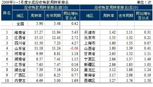 隨著銷售收入的快速增長,1~5月應收賬款有所上升,為341.96億元,同比上升了15.66%,上升幅度在合理范圍。應收賬款周轉率卻較2008年同期加快0.42,達到5.90次。在應收賬款周轉率排名前10的地區中,海南、江西、四川和山東在10次以上,河南接近10;天津、北京、上海三大直轄市回款現象都不佳,值得注意的是應收賬款周轉率排名后10中有4個是西北地區,利潤重要,拿到現金更為重要,不但要叫好還要叫座。