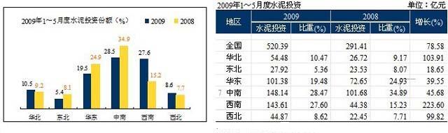 過于旺盛的市場需求也引來高熱度水泥投資,2009年1~5月水泥投資仍然延續2908年的強勢。2008年1~5月水泥投資比2007年增長60%,而今年1~5月增長勢頭更加強勁達到78.58%。如果下半年投資不放緩,對未來市場的壓力將會越來越大。