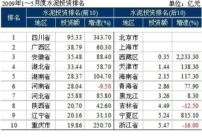 四川省1~5月水泥投資95.33億元,同比增長3倍以上。四川災后重建,企業積極性高漲,但也引起業內外對市場容量和布局的擔憂。2009年新投生產線非常驚人,根據得到的資料有多種版本,綜合判斷2009年新投生產線在30~50條。