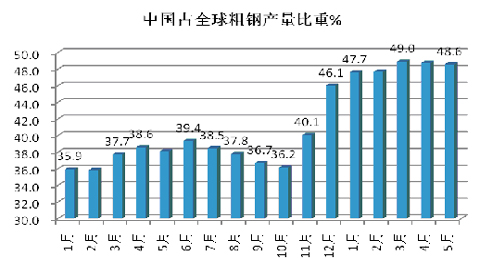 1-5月中國粗鋼產量占全球粗鋼產量的比重提高至48.4%,比上年同期提高了11.1個百分點。從分月的情況看,自上年11月以來,中國占全球粗鋼產量比重就在40%以上,特別是今年以來,前五個月平均比重達到48%以上,一方面說明國際市場需求萎縮程度遠遠高于國內;另一方面,從近三個月的比重變化情況看,3月份為49.0%,4月份為48.8%,5月份為48.6%,比重呈減小的趨勢,說明國際市場需求也出現了積極的調整因素。