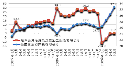 3、從投資增長情況看,今年以來鋼鐵行業的投資增長呈小幅反彈的態勢。1-5月全國城鎮固定資產投資5.35萬億元,同比增長32.9%,比上年同期增速加快7.3個百分點。但黑色金屬冶煉及壓延投資968億元,僅同比增長了0.2%,同去年同期相比,增速大幅回落了20.7個百分點。
