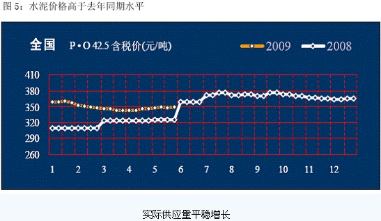 2009年房地產市場盡管仍舊低迷,但表現要好于預期,較上年出現小幅的同比上漲。1-4月房地產開發投資7289.98億元,同比增速4.9%,環比增速加快0.8個百分點,其中,4月單月投資額為2409.69億元,同比增速6.41%,高于1-4月累計增速1.5個百分點。房地產行業的回暖將支持水泥需求。