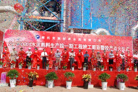 7月18日,內蒙古鄂爾多斯市棋盤井鎮鑫宇集團恒卓水泥公司建設工期近一年的兩條日產2500噸新型干法熟料水泥生產線一期工程在此成功進行點火投產儀式。