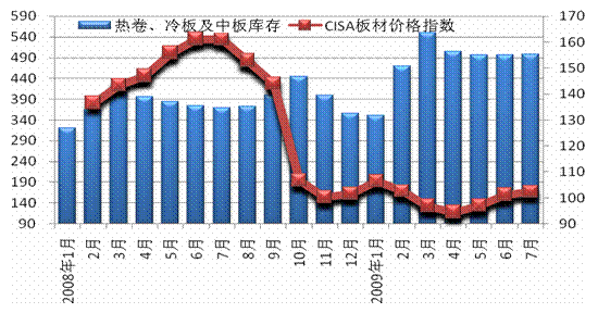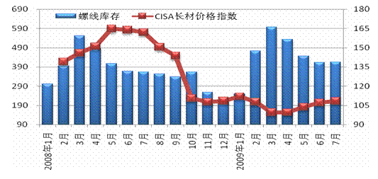 自今年3月份起,長(zhǎng)材價(jià)格逐步企穩(wěn)回升,與之相對(duì)應(yīng)的則是庫存水平的大幅回落,7月庫存比3月庫存累計(jì)降低了30%。然而庫存持續(xù)消減的趨勢(shì)在7月份出現(xiàn)停滯,庫存呈觸底回升的趨勢(shì),價(jià)格漲幅也趨于和緩。一方面是由于庫存消化達(dá)到底部,面對(duì)需求和價(jià)格的上升,流通商重新開始建立庫存,另一方面,也表明預(yù)計(jì)鋼市走向趨升的市場(chǎng)信心較為充足。