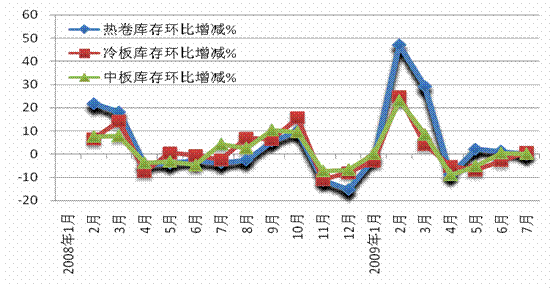 從熱卷、冷板和中板庫存環(huán)比變化情況看,出現(xiàn)了同長(zhǎng)材相似的變化趨勢(shì)。