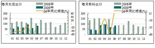 6月份熟料出口量為81.37萬噸,較5月份環(huán)比增加了14.84萬噸,同比增速23.38%;累計(jì)出口量同比增速較5月份提升近7個(gè)百分點(diǎn),為-44.9%;平均離岸價(jià)為38.41美元/噸,基本與5月份持平,較2008年同期增長(zhǎng)4.67美元/噸。