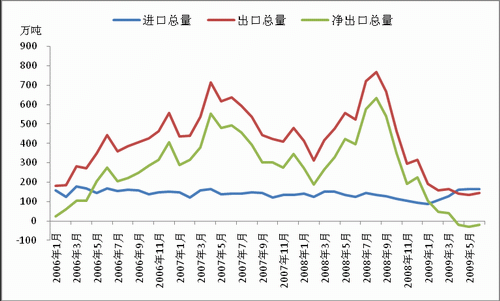受世界經(jīng)濟衰退、需求大幅萎縮的影響,進入2009年國內(nèi)鋼材出口面臨嚴峻的困境與挑戰(zhàn)。在已經(jīng)過去的2009年上半年,國內(nèi)鋼材貿(mào)易進出口總量大幅縮減、出口持續(xù)低迷成為市場最主要的特征,體現(xiàn)為國內(nèi)鋼材出口總量同比大幅減少,相對而言,由于需求、國內(nèi)外價差等因素的影響,進口總量小幅上升。