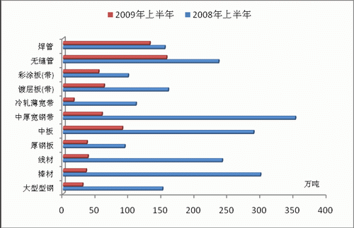 2009年上半年國內(nèi)鋼材出口市場經(jīng)歷了2006年以來最為嚴峻的惡劣形勢,國內(nèi)市場主要鋼材出口品種、主要出口目的地鋼材出口量和出口金額均大幅縮減,國內(nèi)市場再次出現(xiàn)凈進口局面。
