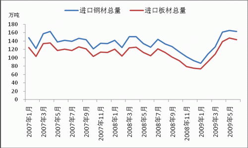 2009年上半年國內(nèi)進口鋼材812.2萬噸,同比下降僅1.6%。在主要進口品種中,板材累計進口704.4萬噸,同比增長2%,成為國內(nèi)鋼材從凈出口轉(zhuǎn)向凈進口狀態(tài)的主要變化因子之一;棒線材累計進口32.3萬噸,同比下降37.3%;管材累計進口36.7萬噸,同比下降27.6%。