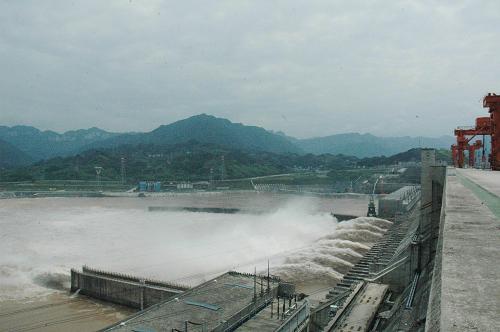 8月6日拍攝的正在開閘泄洪的三峽大壩。記者從中國三峽總公司獲悉,8月6日8時,三峽水庫入庫流量上漲至55000立方米/秒,這標志著三峽大壩迎來2004年以來最大流量的長江洪峰。