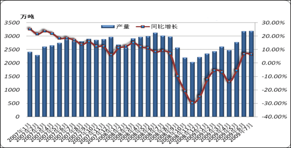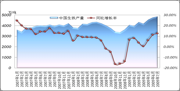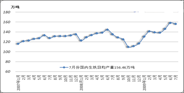 『國內方面』2009年7月,我國共生產生鐵4850.4萬噸,比去年同期增加了617.69萬噸,同比增長了14.6%。今年1-7月份,我國累計生產生鐵30879.21萬噸,同比增長7.2%。7月份,我國生鐵日均產量繼續(xù)保持較高水平,平均日產量為156.46萬噸。見圖3、圖4.