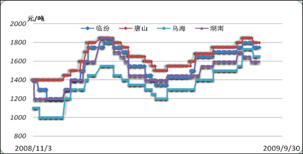 截止到2009年9月底,全國主要區域焦炭市場的波動情況如下: