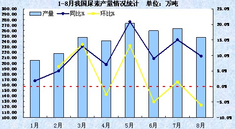2009年1-8月我國尿素產量累計1958.2萬噸,同比增長10.37%。8月份,中國尿素產量同比增加9.8%,環比降低6%。